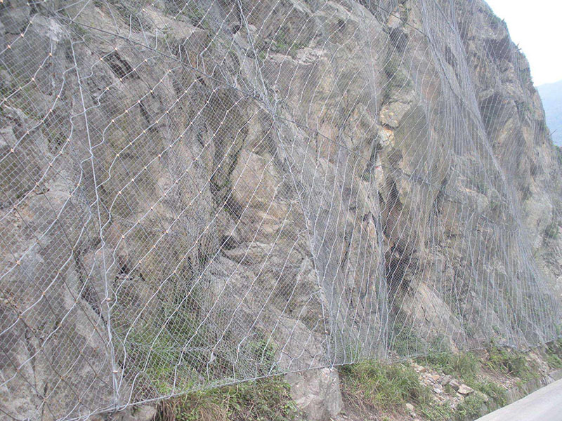 GAR2型主动防护网是采用Φ8的钢丝绳(抗拉强度为1770Mpa,破断拉力>40KN)编制并在结点处用专用“十字扣”固定而成,为边坡防护网的主要特征构件之一,在主动防护中通过钢丝绳网的覆盖来实现边坡的加固,其开放特征可以实现对坡面天然植被和植被生长条件的17631598285佳保护,实现环境保护与灾害治理的有机结合;在被动防护系统中,其柔性特征充分体现了“以柔克刚”的思想,实现崩塌落石的有效拦截。