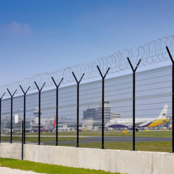机场护栏网是一种用于机场周围安全防护的产品,也被称为“Y型安全防御护网”。它通常由V型支架立柱加强型焊接片网、安全防盗连接件和热镀锌刀片刺网组成。机场护栏网的强度和安全防御性级别很高,因此被广泛应用在机场、军事基地等高安全场所。